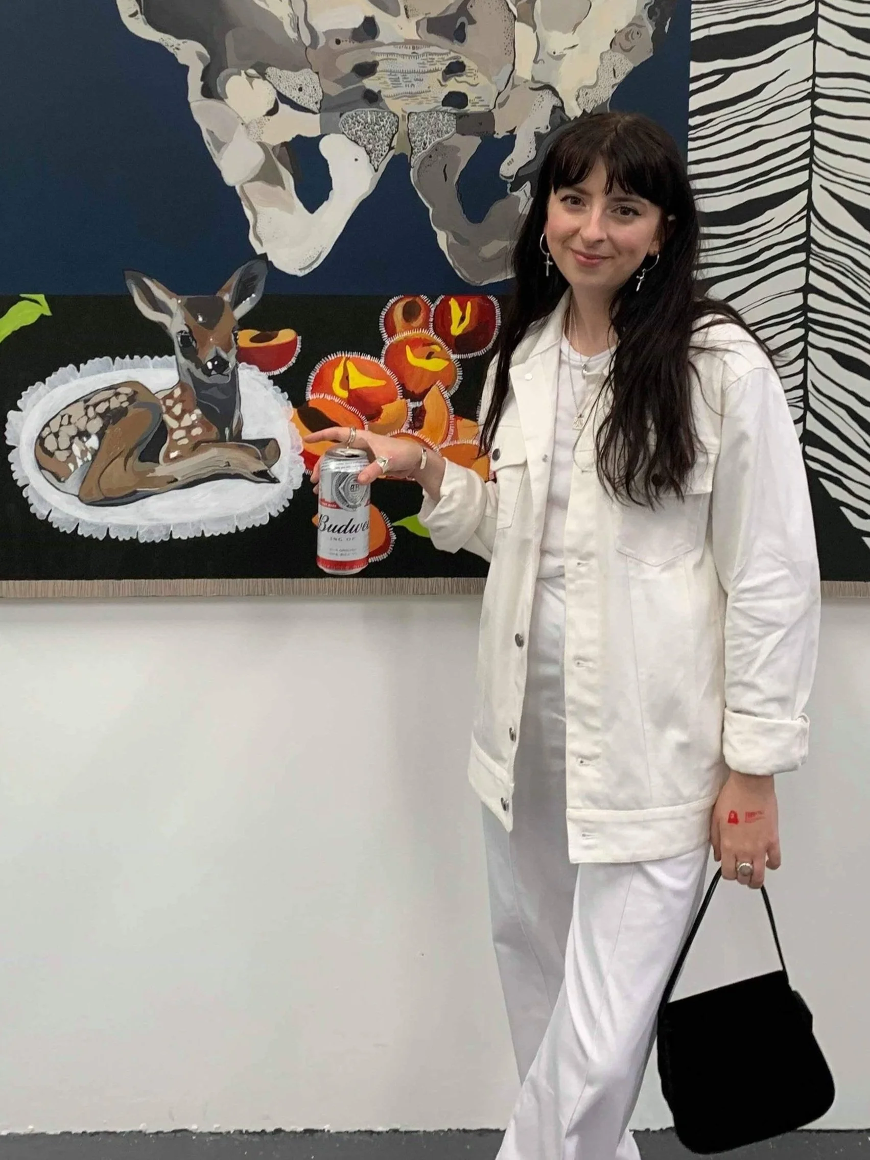 Allowing the paint its own choice of seat, documenting personal surroundings focused on the idea of ‘The Object’. Building on sensation and memory inside an imagined framework. Characterising and confronting this, in juxtaposition with collage, colour and texture. Johnson works without primary sketching and prefers to feel as though the images are sculpted forward, toying with dark, dull tone in partnership with brash primary colour. Thus constructing the works “sticker-like” quality, creating that flatness which feels it could still, be dived into.